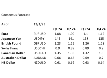 Due to the economic difficulties in China and Europe, cross-border asset flows appear to have favored the US dollar. For 2024, the consensus estimate for the US GDP is approximately 1%. Based on the consensus 2023 growth at this time last year, the trajectory for this time next year is uncertain. The consensus forecasts for the main currencies are provided below. Should you require access to additional currency forecasts, please feel free to contact your account manager.